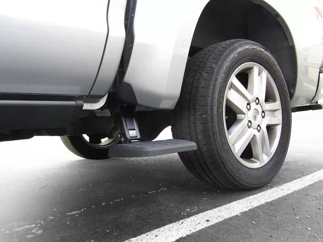 Side steps for hard-working trucks. The AMP Research Bedstep2 mounts just behind the cab, forward of the rear wheel, providing a faster, easier and safer route to access toolboxes, equipment and cargo in the bed. Easily installed, this frame-mounted, retractable truck step can be mounted on either side of the truck box, and it flips down or retracts with just the nudge of your foot.