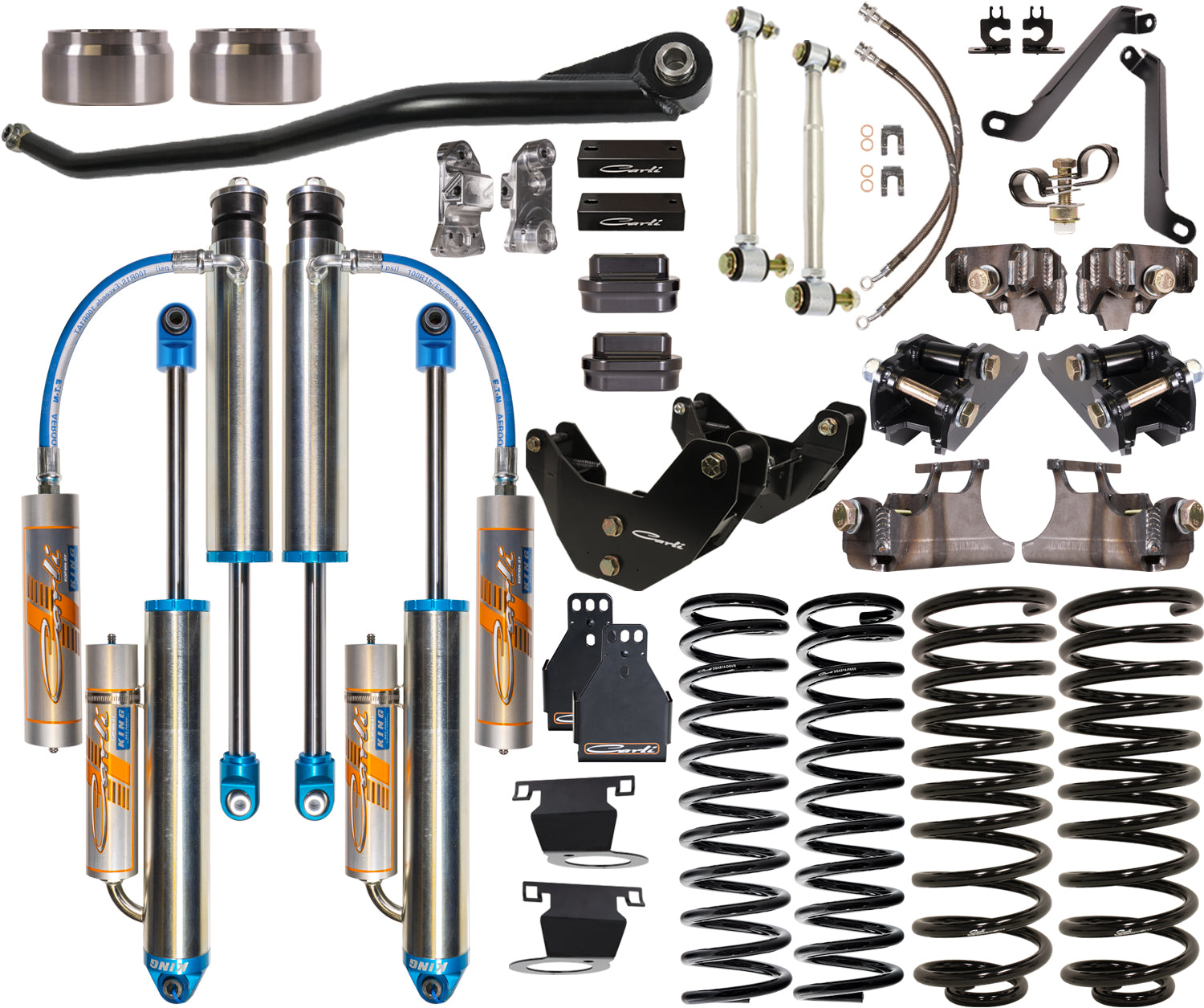 | CS-DD30SPKG-14-H | Carli Tuned King 3.0" Remote Reservoir Shock Package with Stainless Shafts, Reservoir Mounts, Brake Line Kit, Coil Isolator Supports, Front Lower Shock Mounts, Rear Upper and Lower Shocks Mounts, Bed Supports and E-Brake Relocation Bracket |
