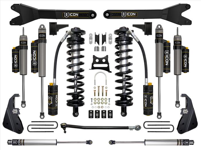 This Stage 6 system sees the inclusion of the ICON Vehicle Dynamics Ford Super Duty Radius Arm System that feature a sealed pivot bushing that minimizes road feedback and ensures a long life and quiet operation. Additionally, their fabricated, fully boxed design ensures strength and utilizes a profile optimized for tire clearance at full steering lock, making a 37” tall tire clear without coming in contact with the radius arm.