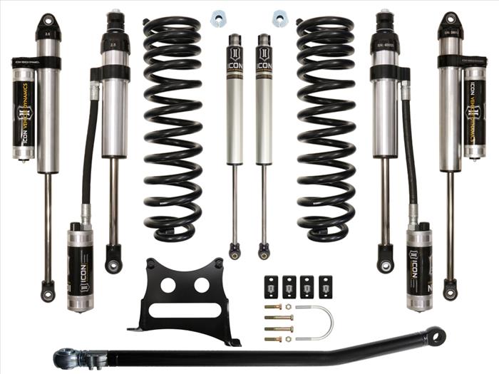 The ICON 2.5” suspension system is a great way to level your 4WD 2005-2016 Ford F250/350 Super Duty while improving ride quality and performance. This Stage 5 system is great for towing, rough construction site terrains, and country dirt roads all while keeping a smooth highway feel. Also included in this stage is ICON's CDC Valve front to back for those desiring an easy way to tune the ride externally with 10 settings from soft to hard. ICON's Stage 5 System is comprised of dual rate coil springs, alignment cams for adding caster, adjustable track bar w/ bearing, dual steering stabilizer kit with ICON 2.0 Aluminum Series stabilizers, and ICON 2.5 Aluminum Series remote reservoir shocks front and rear w/ CDCV. ICON 2.5" reservoir shocks ensure optimum performance by increasing the duration of consistent damping regardless of situation, keeping the shocks at a cooler operating temperature during heavy use. With the endless hours ICON has spent testing and tuning our suspension components and shocks as a complete package, you can rest assured you have the best suspension solution on the market.