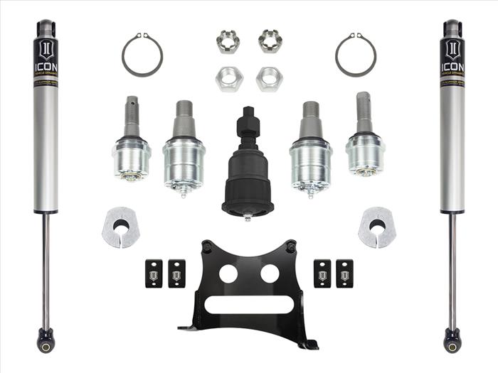 This Stage 3 Ultimate Front End Kit for the 2005-2022 Ford F-250 and F-350 Super Duty 4WD features an ICON Dual Steering Stabilizer System is designed to minimize bump steer feedback and smooths out the roughest of terrains felt through the steering wheel. By mounting the 2.0 Aluminum Series shock absorbers in an opposing manner the push/pull effect from their internal pressure is canceled out. This allows for far greater steering damping than available from a single, similarly sized steering stabilizer shock while ensuring the truck tracks straight down the road. This system bolts to the factory differential cover and wraps around the axle for a secure fit without cutting, welding or drilling. The shocks are connected to the tire rod with black anodized billet aluminum clamps for a secure fit and clean finish.