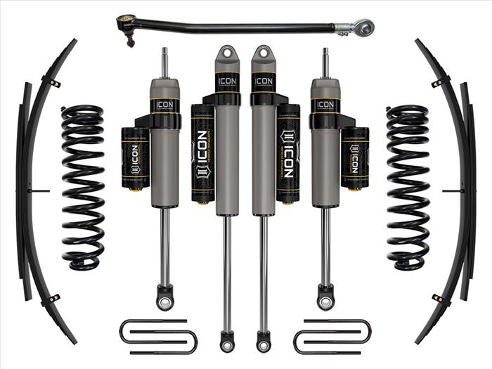 The ICON 2.5” suspension system is a great way to lift your 4WD 2017-2019 Ford F-250/F-350 Super Duty while improving ride quality and performance. This upgraded Stage 3 system is great for towing, rough construction site terrains, and country dirt roads all while keeping a smooth highway feel. ICON's Stage 3 System is comprised of dual rate coil springs, 2.5 Aluminum Series piggyback reservoir front and rear shocks, adjustable front track bar with massive FK rod end, alignment cams for adding caster, and rear leaf spring expansion packs with blocks and U-bolts for a more compliant ride and reduced axle wrap. ICON 2.5" piggyback reservoir shocks ensure optimum performance by increasing the duration of consistent damping regardless of situation, keeping the shocks at a cooler operating temperature during heavy use. With the endless hours ICON has spent testing and tuning our suspension components and shocks as a complete package, you can rest assured you have the best suspension solution on the market.