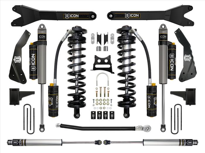 This Stage 5 system sees the inclusion of the ICON Vehicle Dynamics Ford Super Duty Radius Arm System that feature a sealed pivot bushing that minimizes road feedback and ensures a long life and quiet operation. Additionally, their fabricated, fully boxed design ensures strength and utilizes a profile optimized for tire clearance at full steering lock, making a 37” tall tire clear without coming in contact with the radius arm.