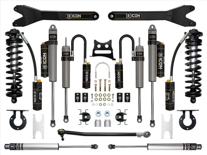 The ICON 2.5-3” coilover conversion suspension system is a great way to lift your 4WD 2017-2022 Ford F-250/F-350 Super Duty while improving ride quality and performance. This upgraded Stage 5 system is great for towing, rough construction site terrains, and country dirt roads all while keeping a smooth highway feel. Also included in this stage is ICON's CDC Valve front and rear shocks, for those desiring an easy way to tune the ride externally with 10 settings, from soft to hard. ICON's Stage 5 System is comprised of 2.5 Series CDCV remote reservoir coilovers that are adjustable from 2.5-3” or 3.25-3.75 of front lift over stock (depending on year model and option package), CDCV 2.5 Aluminum Series remote reservoir front secondary shocks for maximum front damping ability, adjustable front track bar with massive FK rod end, dual steering stabilizer kit with ICON 2.0 Aluminum Series stabilizers, alignment cams for adding caster, rear leaf spring expansion packs with blocks and U-bolts for a more compliant ride and reduced axle wrap, and ICON 2.5 Aluminum Series CDCV piggyback reservoir rear shocks. ICON 2.5 Series remote and piggyback reservoirs ensure optimum performance by increasing the duration of consistent damping regardless of situation, keeping the shocks at a cooler operating temperature during heavy use. With the endless hours ICON has spent testing and tuning our suspension components and shocks as a complete package, you can rest assured you have the best suspension solution on the market.