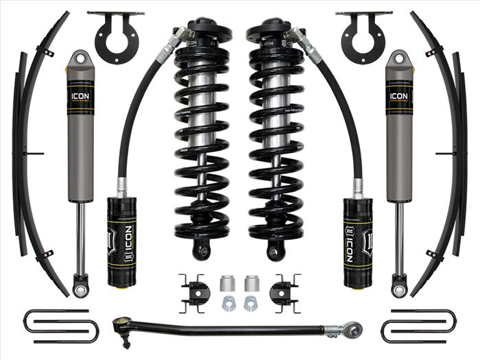The ICON coilover conversion suspension system is a great way to lift your 4WD 2017-2023 Ford F-250/F-350 Super Duty while improving ride quality and performance. This upgraded Stage 2 system is great for towing, rough construction site terrains, and country dirt roads all while keeping a smooth highway feel. ICON's Stage 2 System is comprised of 2.5 Series remote reservoir coilovers that are adjustable from 2.5-3” or 3.25-3.75 of front lift over stock (depending on year model and option package), adjustable front track bar with massive FK rod end, alignment cams for adding caster, rear leaf spring expansion packs with blocks and U-bolts for a more compliant ride and reduced axle wrap, and ICON 2.5 Aluminum Series internal reservoir rear shocks. With the endless hours ICON has spent testing and tuning our suspension components and shocks as a complete package, you can rest assured you have the best suspension solution on the market.