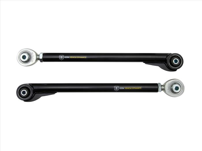 The ICON Tubular Rear Lower Link System helps free up rear axle movement on the 2020-2023 Jeep Gladiator and 2019-2023 Ram 1500 to allow for increased suspension travel and articulation. Formed using 1 1/2” x .313 wall DOM Tubing for high strength, with CNC machined threaded ends and bushing housings, and feature a multi-stage black powder coat finish. These lower links are designed specifically for high clearance for reduced contact with trail obstacles and massive FK Rod End at one end, along with a dual-durometer, high angle greaseless bushing at the other end yields the best combination of maximum travel and articulation while isolating and damping road noise and vibrations. Hit the trail with the confidence of knowing your suspension components are covered by ICON’s Limited Lifetime Warranty.