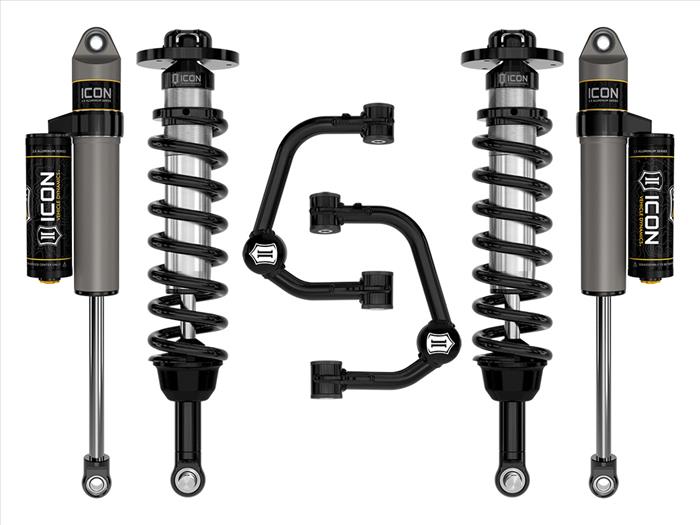 ICON Vehicle Dynamics 2021-2023 Ford F-150 4WD suspension systems are designed with maximum performance and the serious driver in mind. ICON engineers’ primary focus is to increase wheel travel and damping ability, which translates into outstanding vehicle control and ride quality both on and off-road. This Stage 2 system includes vehicle-specific tuned 2.5” coilover shocks featuring an internal reservoir for exceptional cooling properties and ICON-engineered coil springs for superior vehicle “feel” through the range of travel. These coilovers are also height adjustable for 2.75-3.5” of front lift over stock, allowing the use of larger, more aggressive wheel and tire combinations. Tubular Delta Joint Pro upper control arms on the F-150 not only add strength and durability, but help retain factory alignment spec range, increasing caster over stock and allow for the extra lift height this system provides. ICON 2.5 Aluminum Series piggyback reservoir rear shocks utilize a vehicle-specific valving and offer increased damping and head dissipation, balancing the performance of the truck from front to rear. The ICON Vehicle Dynamics 2021-2023 F-150 4WD Stage 2 suspension system is an excellent choice for those drivers looking to enhance the capabilities of their pickup on the road as well as in the dirt.