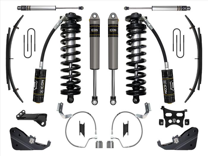 This ICON Vehicle Dynamics 4-5.5” coilover conversion system is a great way to lift your 4WD 2023 Ford F-250/F-350 Super Duty while drastically improving ride quality and performance and allowing fitment of larger, more aggressive wheel and tire combinations. This Stage 3 system is perfect for on-road and towing use, as well as job site duty, washboard gravel roads, and general off-road adventures.
