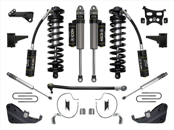 This ICON Vehicle Dynamics 4-5.5” coilover conversion system is a great way to lift your 4WD 2023 Ford F-250/F-350 Super Duty while drastically improving ride quality and performance and allowing fitment of larger, more aggressive wheel and tire combinations. This Stage 4 system is perfect for on-road and towing use, as well as job site duty, washboard gravel roads, and more agressive off-road adventures.