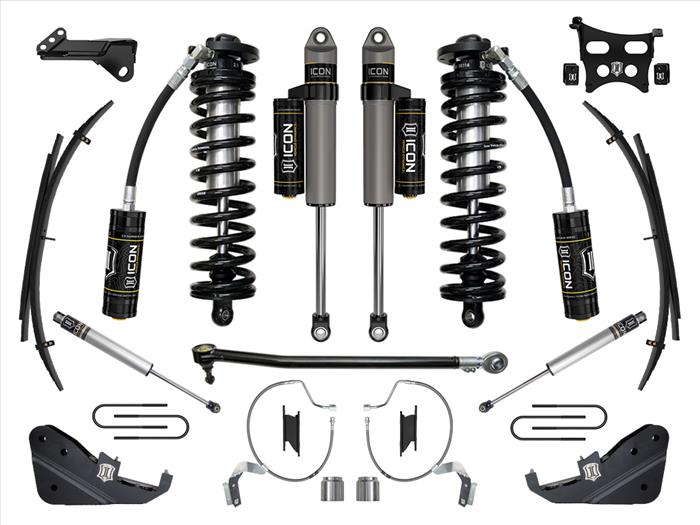 ICON's 4-5.5” Lift Stage 4 Coilover Conversion System features 2.5 Series remote reservoir coilovers that provide superb on-road comfort and off-road performance while at the same time allowing for end-user ride height adjustability. These bolt-in coilovers also allow the option to mount secondary shocks in the stock location, effectively doubling shock damping ability. Their remote reservoirs greatly increase shock oil volume and heat dissipation surface area to resist overheating and cavitation under hard use, which can lead to damper fade. Fabricated radius arm drop brackets correct suspension geometry and ensure proper wheel alignment with the OE radius arms. The fabricated track bar drop bracket allows the axle to be properly centered under the frame and reduces road feedback throughout the steering system with improved on- and off-road manners thanks to the elimination of bump steer. An adjustable track bar allows for on-vehicle adjustment to fine tune track alignment as well as eliminating the deflective OE track bar bushings for an overall more rigid unit to improve the vehicles handling characteristics. ICON’s dual opposing steering stabilizer kit featuring ICON 2.0 Aluminum Series shocks improves steering damping to better control undesirable steering feedback caused by larger tires. Leaf spring expansion packs provide 2" of rear lift over stock with improved ride quality and small bump compliance while also reducing axle wrap compared to lift blocks. ICON 2.5 Aluminum Series piggyback reservoir rear shocks feature a vehicle specific tune for improved vehicle handling and excellent ride quality on- and off-road with improved performance compared to 2.0 Aluminum Series shocks. The included box kit includes fabricated front sway bar drop brackets to prevent bind, heavy-duty aluminum bump stop spacers, and high quality stainless steel extended brake lines.