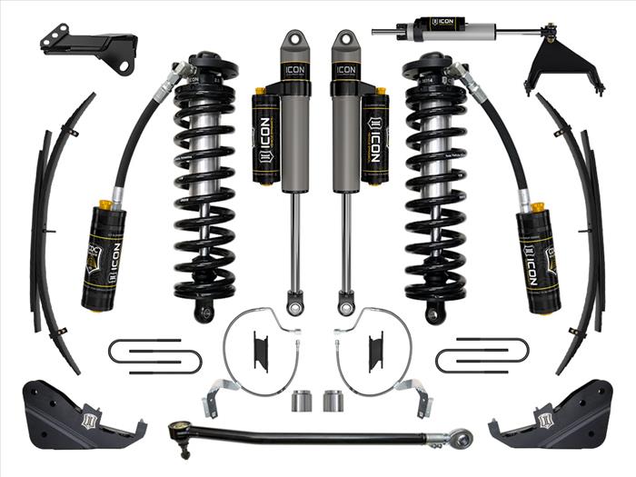 ICON’s Centerline steering stabilizer kit features a 2.5 Aluminum Series shock absorber with a piggyback reservoir for improved steering damping compared to ICON dual 2.0 steering stabilizers, better controlling undesirable steering feedback caused by larger tires while also improving ground clearance. Leaf spring expansion packs provide 2" of rear lift over stock with improved ride quality and small bump compliance while also reducing axle wrap compared to lift blocks. ICON 2.5 Aluminum Series piggyback reservoir CDCV rear shocks feature a vehicle specific tune for improved vehicle handling and excellent ride quality on- and off-road with improved performance compared to 2.0 Aluminum Series shocks. The included ICON CDC Valves are externally adjustable valves that restrict oil flow into the reservoir which creates 10 levels of compression damping force ranges. The included box kit includes fabricated front sway bar drop brackets to prevent bind, heavy-duty aluminum bump stop spacers, and high quality stainless steel extended brake lines.