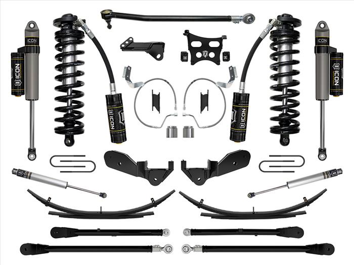 ICON's 4-5.5” Lift Stage 6 Coilover Conversion System features 2.5 Series remote reservoir coilovers that provide superb on-road comfort and off-road performance while at the same time allowing for end-user ride height adjustability. These bolt-in coilovers also allow the option to mount secondary shocks in the stock location, effectively doubling shock damping ability. Their remote reservoirs greatly increase shock oil volume and heat dissipation surface area to resist overheating and cavitation under hard use, which can lead to damper fade. ICON Vehicle Dynamics Ford Super Duty 4-Link kit further improves performance by eliminating suspension bind commonly experienced with factory radius arms during articulation and allows on-vehicle caster angle adjustment. This “freeing up” of the front end and the ability of the 4-Link Kit to maintain positive caster through the range of travel equates to an unparalleled ride quality in all conditions. The fabricated track bar drop bracket allows the axle to be properly centered under the frame and reduces road feedback throughout the steering system with improved on- and off-road manners thanks to the elimination of bump steer. An adjustable track bar allows for on-vehicle adjustment to fine tune track alignment as well as eliminating the deflective OE track bar bushings for an overall more rigid unit to improve the vehicles handling characteristics.
