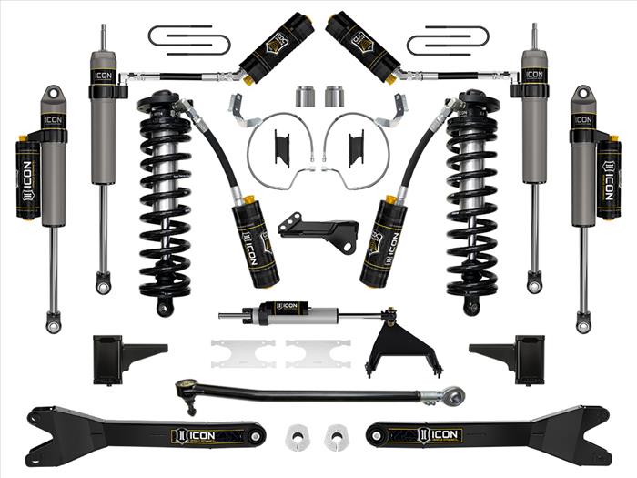 This ICON Vehicle Dynamics 4-5.5” coilover conversion system is a great way to lift your 4WD 2023 Ford F-250/F-350 Super Duty while drastically improving ride quality and performance and allowing fitment of larger, more aggressive wheel and tire combinations. This Stage 7 system is perfect for on-road and towing use, as well as job site duty, washboard gravel roads, and more aggressive off-road adventures.